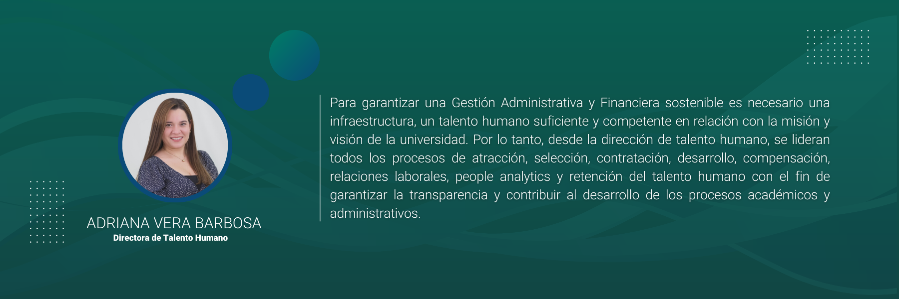 La Institución lidera la Gestión del Talento Humano a través del desarrollo de políticas laborales que garantizan de forma transparente, contribuyendo al desarrollo de los procesos académicos y administrativos, de acuerdo con la normatividad vigente y los lineamientos institucionales. Para esto se desarrollan las unidades de: selección y desarrollo organizacional, nómina y seguridad social, relaciones laborales Y people analytics.